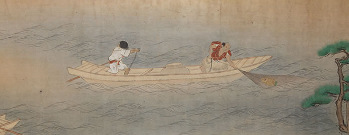 上記写真:浅草寺の縁起絵巻のひとつ「寛文縁起」(部分)。檜前浜成・竹成兄弟がご本尊を感得。