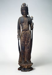 右記写真:左手に蓮華を持ち、右手は掌をこちらに向けて差しのばし、衆生を救う姿勢を示している。お顔立ちも慈悲にあふれている。