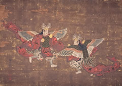 絵馬「迦陵頻伽」。雅楽の「迦陵頻伽」を描いたもの。迦陵頻伽は人頭、鳥体をした空想上の動物で、極楽浄土に住むとされる。江戸時代後期の絵師・鈴木其一の作で、天保12年(1841)の制作