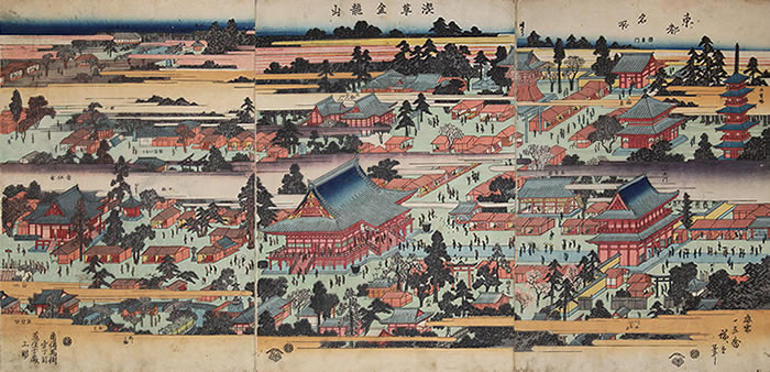 上記写真:「東都名所」に描かれた浅草寺境内。中央に本堂、右奥に五重塔が見える。右の仁王門の前や左の本堂裏には店が立ち並ぶ。