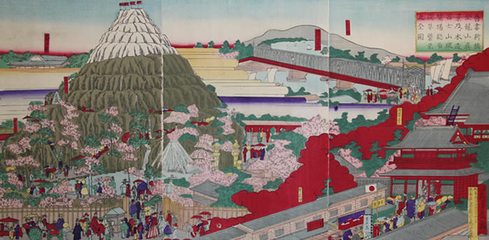 上記写真:「吾妻新橋金龍山真景及ビ木造富士山縦覧場総而浅草繁栄之全図」。明治20年(1887)に6区に完成した富士山を模した観覧施設。