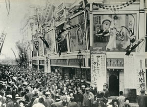 大正3年(1914)頃の6区。建物は日本初の専門映画館「電気館」。