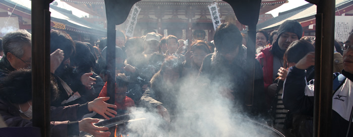 上記写真:本堂の前の常香爐。香炉から立ち上る煙をいただいて無病息災を祈る参拝者が絶えない。