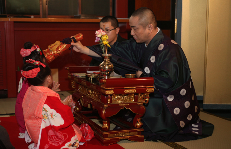 浅草寺では、本堂のご宝前において、「牛玉宝印」(観音宝印)を子供の額にあてて、ご本尊と結縁し、その御加護を頂戴する加持を行っている。加持を受けた子供には、お札とお供物が授与される。