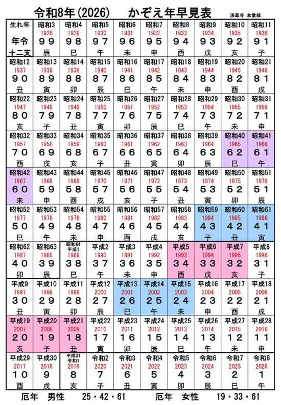 ※青色は男性の、ピンク色は女性の、紫色は男女共に「厄年」です。