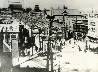 関東大震災後、復興した仲見世。現在の雷門通りから仲見世、本堂を望む(上の画像は昭和4~7年頃)。