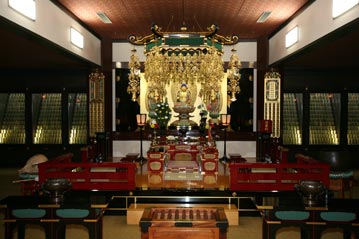 正面に阿弥陀三尊仏が安置され、永代供養位牌が奉安される。 |