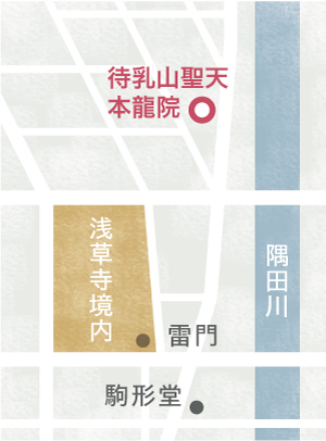 浅草寺の北東、隅田川西岸にある待乳山は、標高約10mの丘である。ここに伽藍を構える待乳山聖天は、正式には本龍院といい、浅草寺の支院のひとつである。