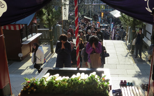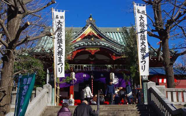 数多い年中行事のなかで最も知られているものは、1月7日の大般若講・大根まつりであろう。法要ののち、正月中にご本尊聖天さまにお供えされた大根を調理した風呂吹き大根が御神酒とともに参拝者に授与され、大いに賑わう。