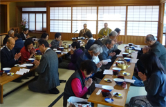 〜月に一度、朝のおまいりを〜 毎月13日、午前7時に本堂で『観音経』を読誦し、朝粥をいただき法話を聞く会。 入会金は無料。参加費は500円。